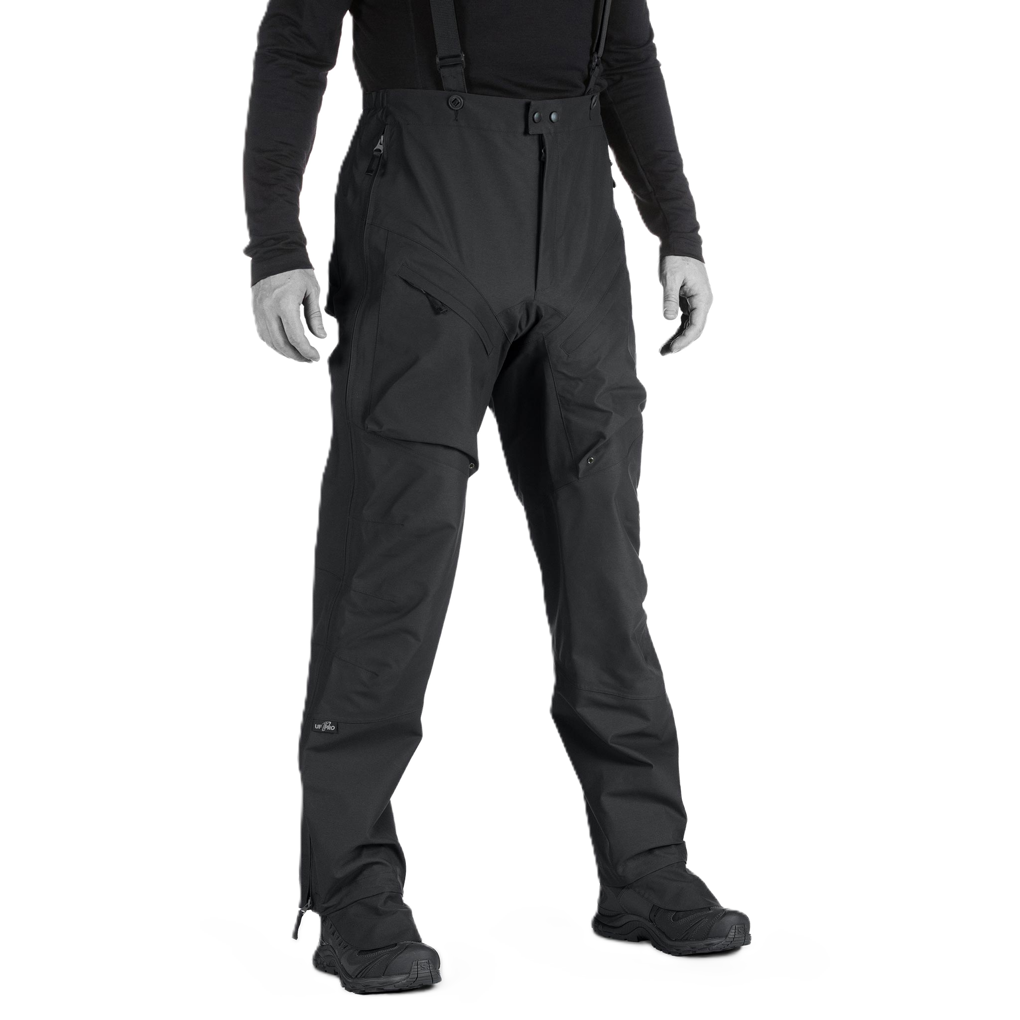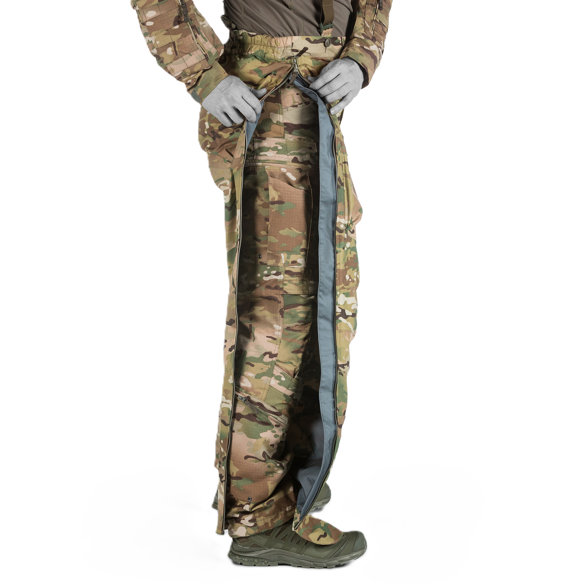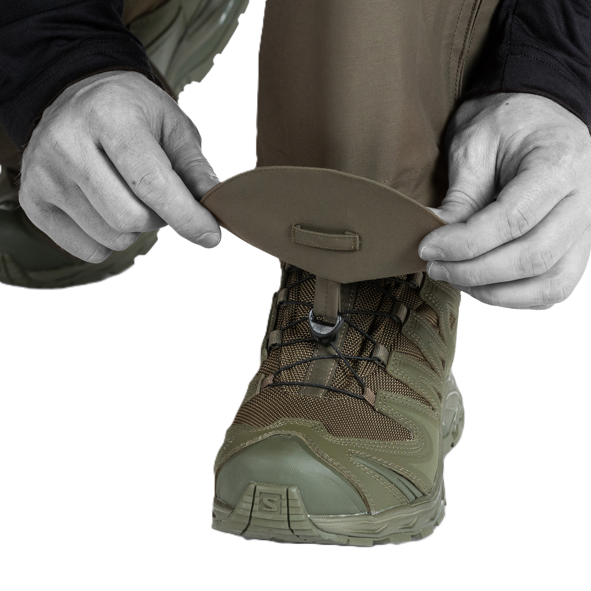 Mukana on innovatiivinen muotoiluelementti, joka parantaa merkittävästi yleistä liikkuvuuttasi ja mukavuuttasi vaativissa tehtävissä ja märissä ympäristöissä. Tämä elementti hyödyntää kengänkoukuissa olevia kengänsuojia, jotka tarjoavat turvallisen yhteyden housujen ja jalkineidesi välille estäen tehokkaasti veden tunkeutumisen ja roskien kertymisen, jotta jalkasi pysyvät kuivina ja asianmukaisesti suojattuina koko toiminnan ajan. Lisäksi se poistaa jatkuvan säätötarpeen, jolloin voit säilyttää keskittymisesi ja tehokkuutesi stressaavissa tilanteissa.