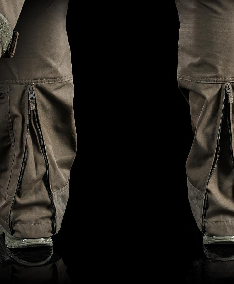 -Leveyssäädettävät lahkeensuut kanadalaisella napilla ja pystysuoralla vetoketjulla.