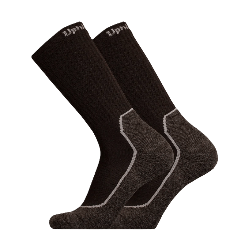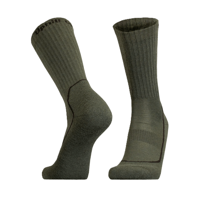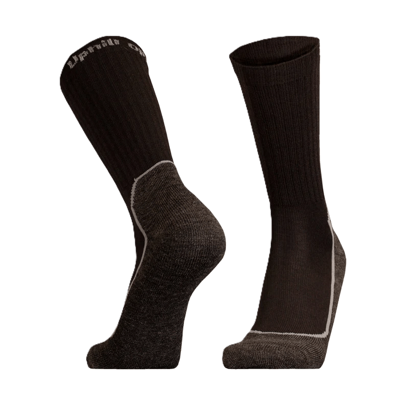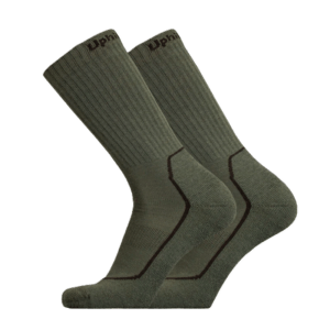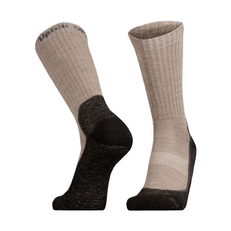 Taktiset merinovillasukat vaativiin ja muuttuviin olosuhteisiin. Sukanvarren resoritaitoksen taakse on neulottu Uphill OPS -teksti.